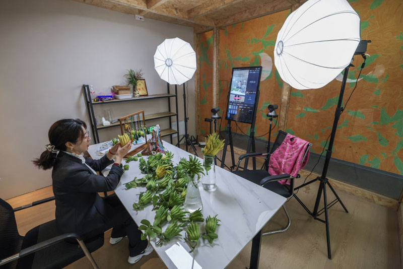 在浙江金华市金东区赤松镇北山口村的金华佛手农林服务中心内的直播间,工作人员进行佛手鲜果及衍生产品的直播销售(2025年10月22日摄)。(新华社记者 徐昱/摄)