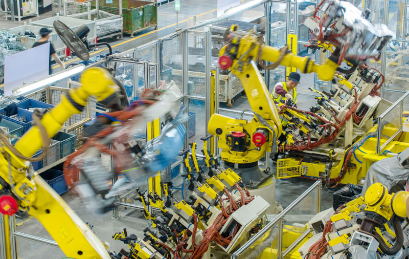 浙江省湖州市长兴经济技术开发区的长兴地通汽车部件有限公司技术人员操控工业机器人生产新能源汽车配件(无人机照片,2025年10月9日摄)。(新华社发 谭云俸/摄)