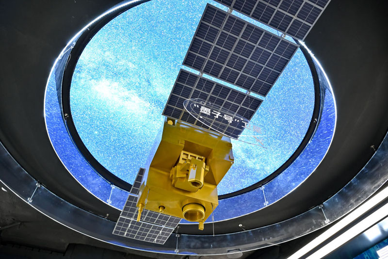 在位于安徽省合肥市的中电信量子信息科技集团有限公司科技体验馆内拍摄的“墨子号”量子卫星模型(2025年7月1日摄)。(新华社记者 张铖/摄)