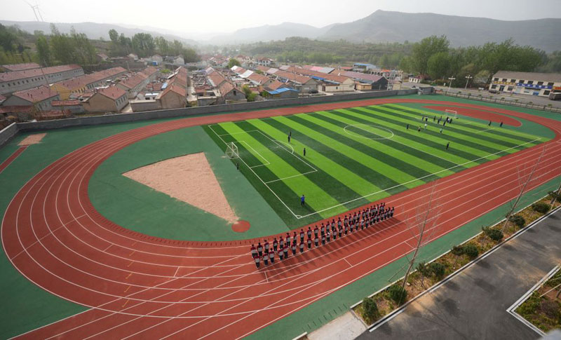 在位于山东潍坊市临朐县石家河村的临朐县弥水教育集团石家河校区,学生在操场塑胶跑道上进行体育锻炼(2025年4月17日摄)。(新华社记者 徐速绘/摄)